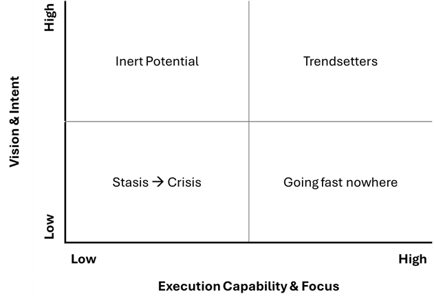 Enterprises may find themselves in one of the four segments, as shown in Figure 1. Those who do not demonstrate either vision or execution focus are perhaps in a stasis that may sooner than later become a crisis.