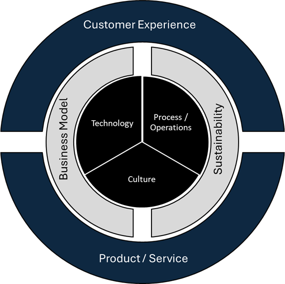 What about a WD-40, a Rolex, Levis, or a Jack Daniels, and many others who have been around for over a century, you may ask.  Prima facie they have been selling the same product, or product line for eons. However, the other 3 W and H are undoubtedly transformed.  Enterprises may thus undertake to transform the way their customers engage with them, or the items they buy from them.  They could change their business model or sustainability commitments in delivering this experience. To do so, they typically need to transform their Process (Operations) or Technology.  Most of these transformations are anchored in the culture of the organization and sometimes the culture may need be transformed before other aspects can be transformed.